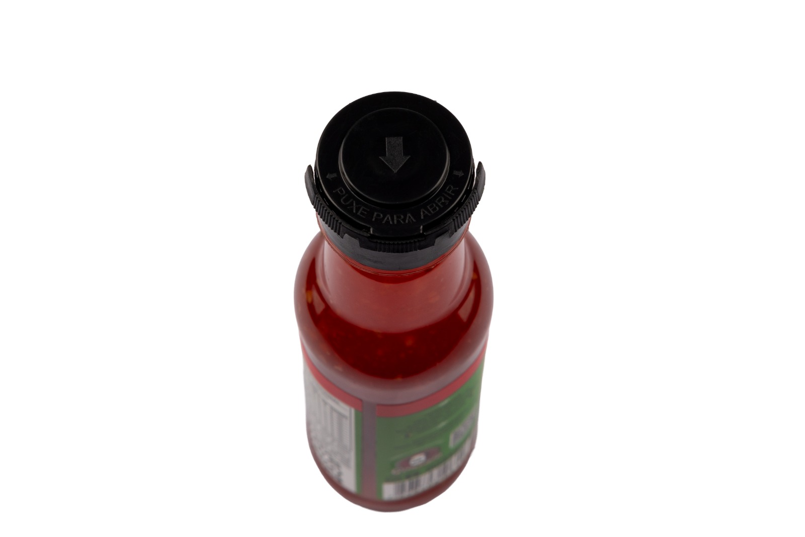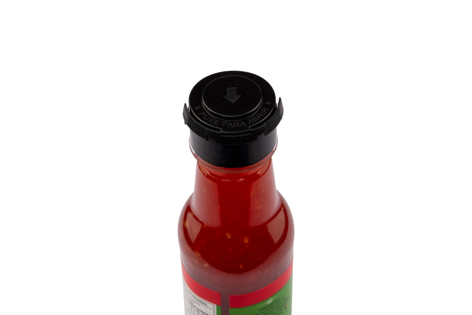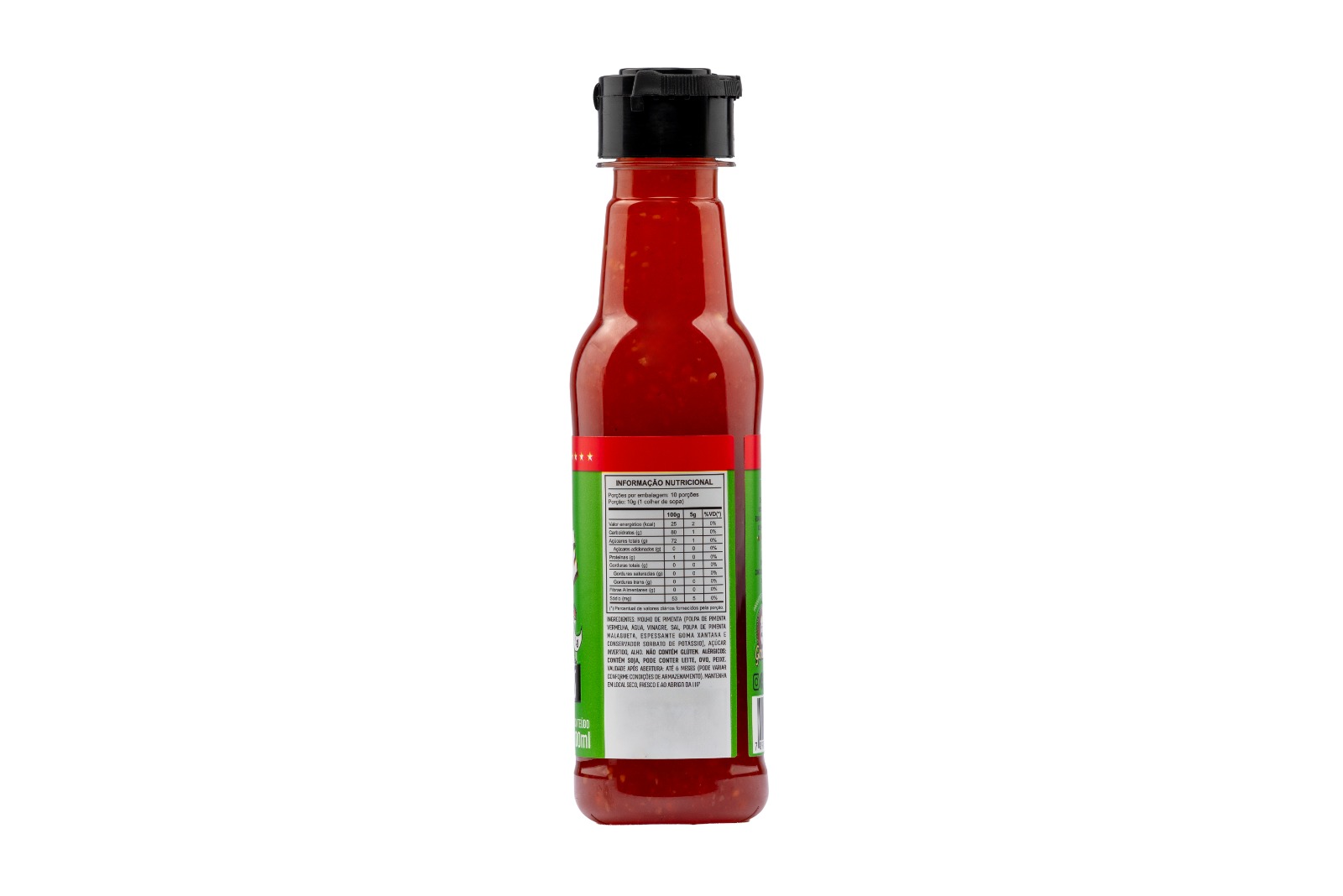 Ingredientes: Molho de pimenta (polpa de pimenta vermelha, água, vinagre, sal, polpa de pimenta malagueta, espessante goma xantana e conservador sorbato de potássio), açúcar invertido, alho.